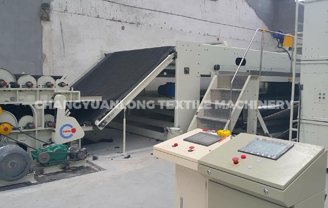 2. CYLKS-开松机: 本机开松效果好,不易缠棉,产量高。把纤维、原料经喂入平帘输送至喂入罗拉,再由开松辊高速开松后,经输棉风机以适量的风量输送纤维原料供后道工作使用;并配备桥式除铁装备。